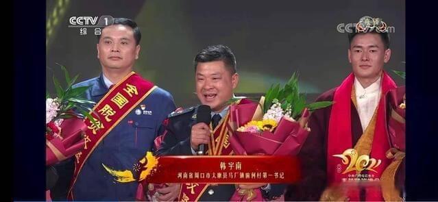 “2020全国脱贫攻坚奖”获奖个人及组织代表亮相春晚环节,河南省周口市税务局驻太康县马厂镇前何村第一书记韩宇南作为代表亮相。